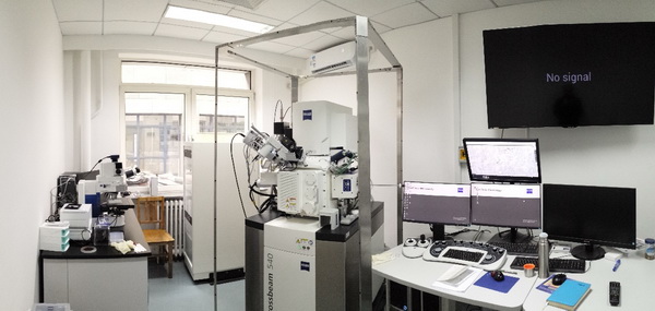 聚焦离子束-扫描电镜(Focused ion beam – scanning electron microscopy,FIB-SEM)是一款集高分辨场发射扫描电镜(SEM)的成像功能和聚焦离子束(FIB)的切割功能为一体双束系统,又可以用于对岩石中的矿物、有机质(或干酪根)和孔隙进行微米-纳米尺度的高精度的三维成像,又可以对其它材料做纳米加工,比如透射电镜样品制备,还可做晶体材料二维和三维EBSD。