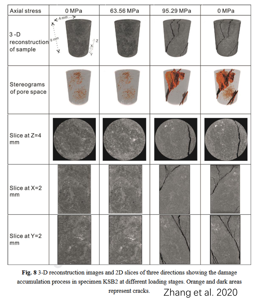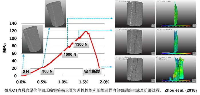 实验室将单轴压缩-拉伸技术引入微米CT内,实现了微米CT几乎同步对岩石压缩-内部破裂过程进行高分辨3D成像和应力-应变过程进行监测。