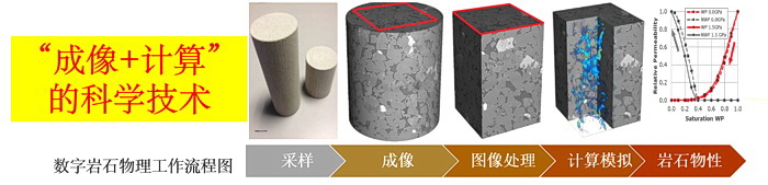 数字岩石物理的基本原理是“成像+计算”(下图)。先利用先进成像设备(如微米CT、聚焦离子束-扫描电镜等)获得岩石样品矿物基质和孔隙的高分辨三维结构(可称数字岩心),经过图像处理,然后在数字岩心上模拟计算岩石的应力-应变、孔隙内流体输运等过程,获得岩石流体传输(如渗透率等)、力学(如弹性模量、泊松比等)、 电学等性质(下图)。