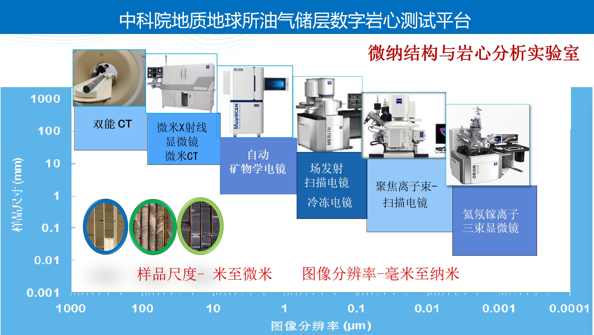 测试分析样品从二维到三维、尺度从米到微米、分辨率从1毫米到0.5纳米,在不同尺度研究岩石或其它材料的结构、成分和性质等。
