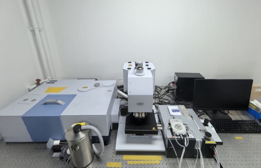 仪器型号为Bruker VERTEX 80V + Hyperion II, 配置有MCT、DLATGS、铟镓砷、硅等检测器,能够获得0.4-25微米波长范围的反射、透射光谱,2.5-20微米波长范围的发射光谱,测量束斑最小可达10微米。