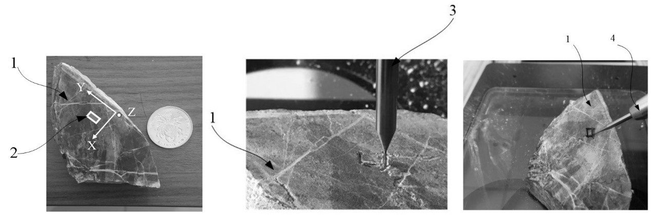 在微区显微分析方法的实验中,样品的获取和制备极为关键。为了从大块体岩石中获得目标区域的微区样品进行分析,目前比较广泛使用的微区取样方法主要有:(1)借助微区取样仪钻取粉末样品;(2)借助空心钻钻取岩芯样品。然而,方法一无法进行微区块体取样,钻取的粉末样品仅能进行同位素化学分析而无法实现岩石目标区域的其他微区分析,如显微结构表征、矿物组成和SIMS年代学分析等。方法二所钻取的圆柱状样品难以代表原岩的连续特征,不适于具有多期次生长环带、解理结构和成分交代特征复杂的地质岩石微区取样。有鉴于此,本领域需要一种新的技术方案来解决上述问题。