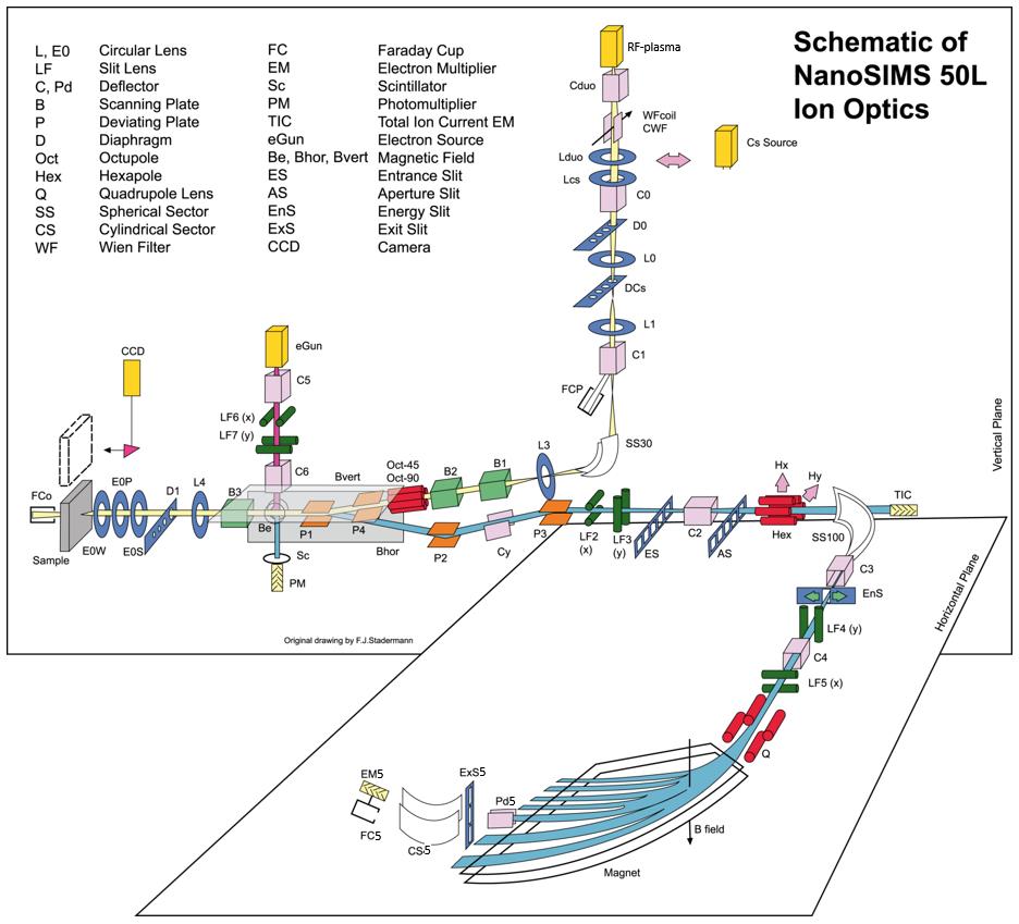 Cameca NanoSIMS 50L型二次离子探针质谱仪与传统的二次离子探针质谱仪(Secondary Ion Mass Spectrometry, SIMS)的工作原理类似(上图为NanoSIMS 50L的离子光学示意图)。