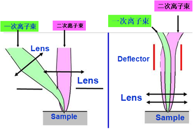 Cameca NanoSIMS 50L型纳米离子探针相比于传统的离子探针具有较高的灵敏度和极高的空间分辨率,这主要得益于Cameca公司对NanoSIMS 50L型纳米离子探针所做的改进,即把原来的一次离子倾斜入射改成垂直入射,并使一次离子流和二次离子流共同使用一套共轴透镜系统(见下图)。一次离子流垂直入射可达到缩小束斑直径(即提高空间分辨率)、增加离子束亮度、减小仪器扫描成像失真度的目的。使用共轴透镜系统大大缩短了接收二次离子的浸没透镜与样品表面间的距离,进而显著提高了二次离子流的接收效率以及仪器的灵敏度。