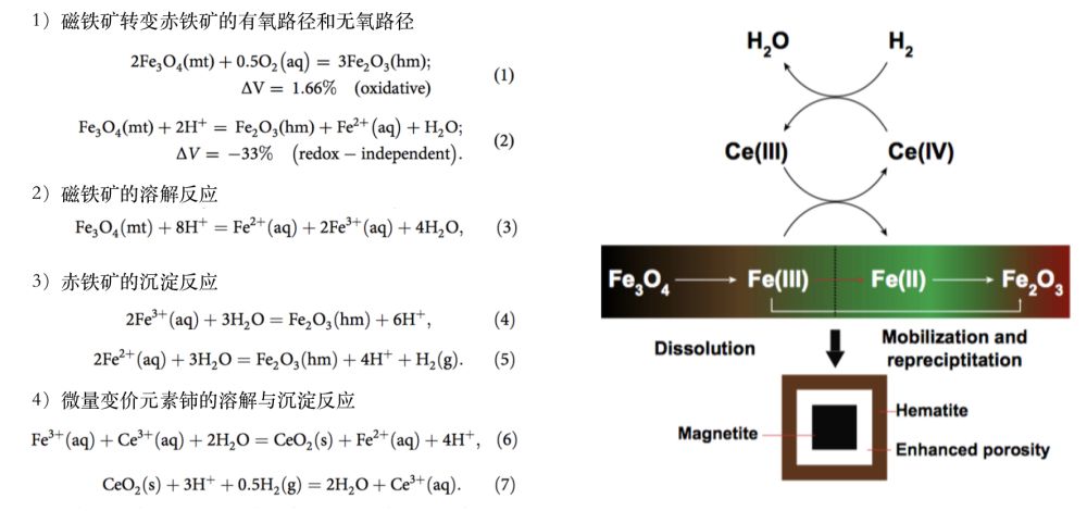 CeO2 颗(图1中的反应6),这会进一步提高溶液的酸度和还原性,进而抑制了赤铁矿反应效率。当溶液中酸度足够高时,又会促进CeO2颗粒的溶解(图1中的反应7),保持溶液中Ce(III)的浓度,降低流体的还原性(表现H2的消耗),因而Fe(II)继续氧化形成赤铁矿(图1中的反应5)。如此循环,磁铁矿不断溶解向赤铁矿转变,表现为新的产物结构(出现孔隙)和增快的反应速率,而溶液中Ce(III)浓度保持稳定,表明了Ce具有催化作用(图1)。因此在磁铁矿-赤铁矿转变造成反应界面处溶液pH值和氧化还原性的细微变化,使得变价微量元素Ce具有了催化功能。磁铁矿转变赤铁矿过程主控于反应界面处的pH值,而溶液中Ce(III)的存在影响了Fe(III)–Fe(II)的相互转化。