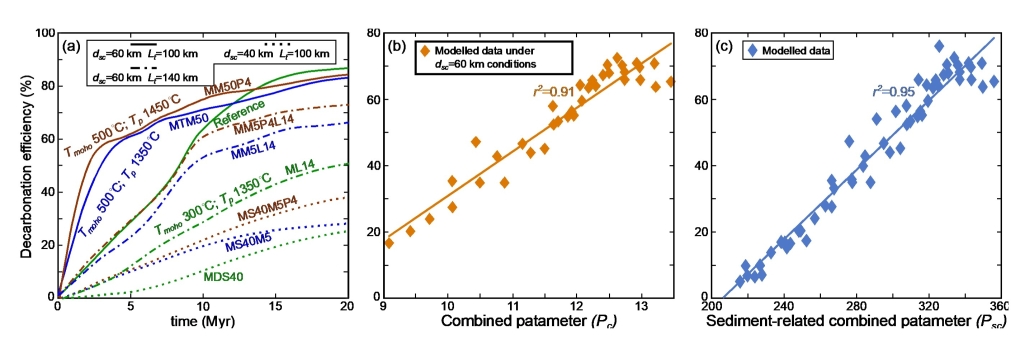 图3 计算模型脱碳效率分别与演化时间(a)、岩石圈热结构相关的组合参数Pc(b)、沉积层和热结构相关的组合参数Psc(c)的拟合曲线图