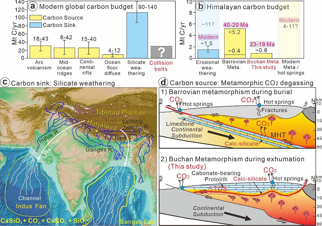 几十年来,碰撞造山带由于山脉隆升和高海拔加剧的硅酸盐风化,通常被认为是净碳汇地。例如,喜马拉雅-青藏高原隆升引起巨量硅酸盐风化剥蚀、并沿着印度河、恒河和雅鲁藏布江(布拉普马特拉河)搬运侵蚀物质/有机碳流入印度洋,带来巨大的碳汇(图1c)。调查估计,喜马拉雅通过硅酸盐风化产生的现代碳汇约为1.5 Mt C/yr (或11 Mt C/yr)。然而,近年来研究发现喜马拉雅的温泉和裂谷正在释放大量的CO2(4–11 Mt C/yr)(图1b)。这种地表CO2去气被归因于深部沉积物的变质脱碳作用。作为经典的大型热碰撞造山带,与高喜马拉雅结晶岩系(GHC)的埋藏和俯冲有关的巴罗型或高压型区域变质作用被认为是主要脱碳过程(图1d)。前人对GHC岩石变质脱CO2通量的估算存在很大差异(2.4–6.6 Mt C/yr,Kerrick and Caldeira,1999;0.4–5.2 Mt C/yr,Rapa et al., 2017;0.14–0.5 Mt C/yr,Groppo et al., 2017, 2022)。然而,大部分这些估算并没有引起足够的重视。那么,喜马拉雅的碳源通量是否真的被严重低估了呢?除了现有碳源,是否还存在其他未知的深部碳源过程和机制?