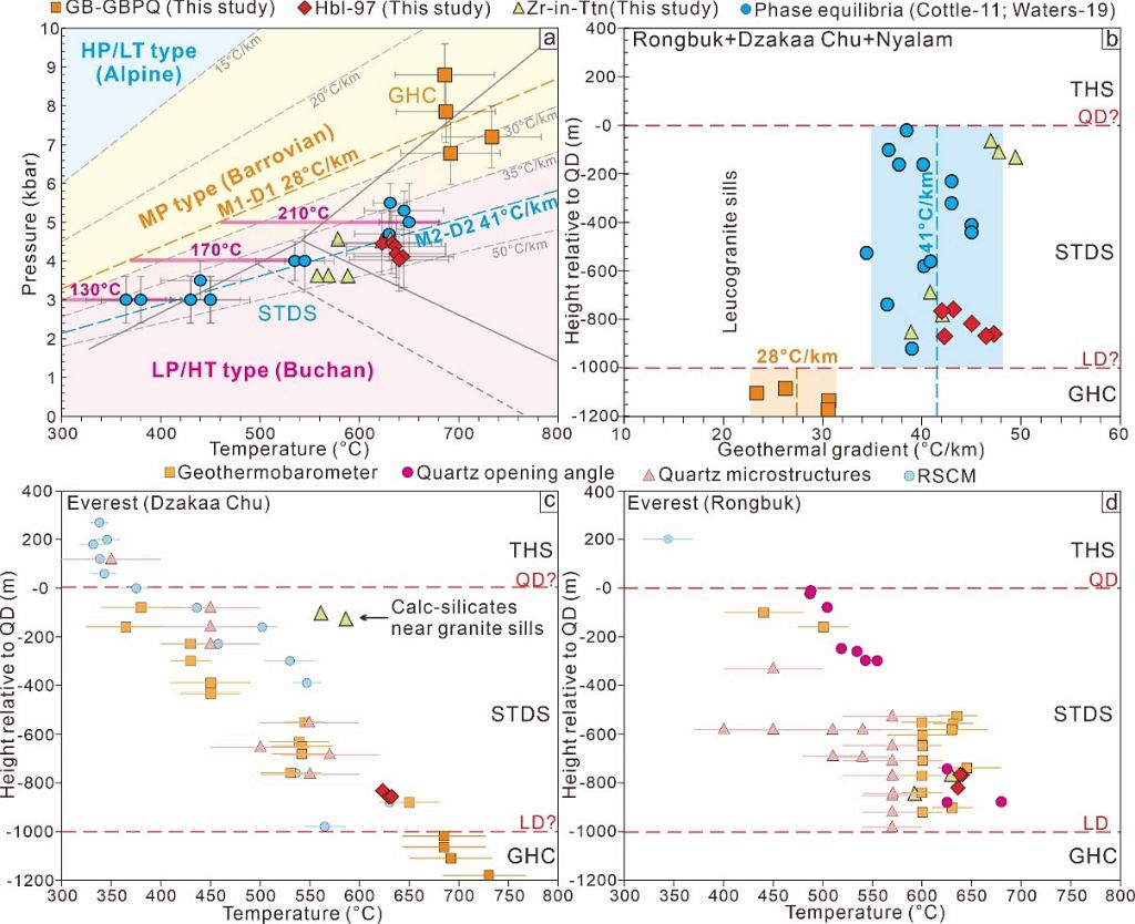 基于上述科学问题,800彩票吴福元院士课题组王佳敏副研究员与Kyle Larson教授、张进江教授、赵亮研究员等合作,对喜马拉雅中部珠峰-扎嘎曲-聂拉木三个剖面的藏南拆离系进行研究,提出并厘定了碰撞造山带未被识别的新碳源:藏南拆离系剪切带向上扩展过程中,拆离断层将下盘高温混合岩(750-–970 C,GHC)与上盘未变质沉积岩(特提斯喜马拉雅)并置,导致上盘底部的含碳酸盐岩石发生巴肯型变质脱碳作用(图1d)。该新碳源机制,主要是通过藏南拆离系来控制的。藏南拆离系是世界上最著名的大型低角度拆离断层,沿喜马拉雅东西延伸达 2400公里;它与喜马拉雅核部高级变质岩的挤出折返过程息息相关,喜马拉雅大多数>8000米的山峰均有藏南拆离系的出露,并可能记录了它们的隆升过程。自Burchfiel et al. (1992)首次提出藏南拆离系的概念以来,其一直是喜马拉雅研究的热点。前人研究主要集中在藏南拆离系的位置划分、变形样式和活动时代等,但对藏南拆离系内岩石的压力-温度(P-T)条件和变质作用时代的研究极少。缺乏变质作用研究的部分原因是其中的富碳酸盐岩石的变质程度普遍较低,不容易做P-T和年代学分析,导致其至今仍缺乏完善的 P-T 时间 (t) 历史演化记录。