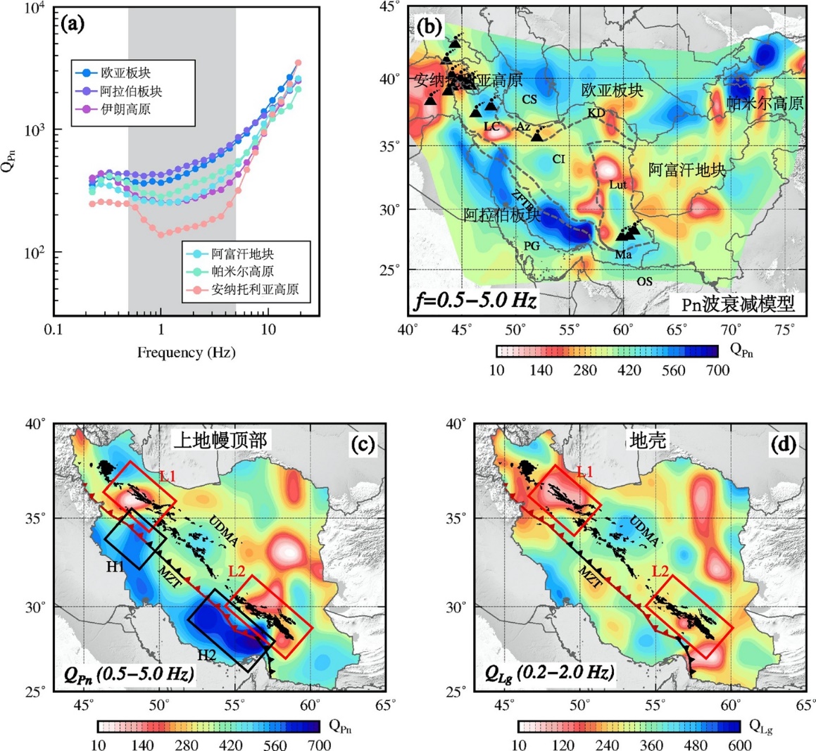 -频率依赖性分析。灰色阴影覆盖的0.5-5.0 Hz被选做Pn波衰减模型的特征频带。(b)研究区内 0.5-5.0 Hz宽频带Pn波衰减模型。(c)伊朗高原内部上地幔顶部