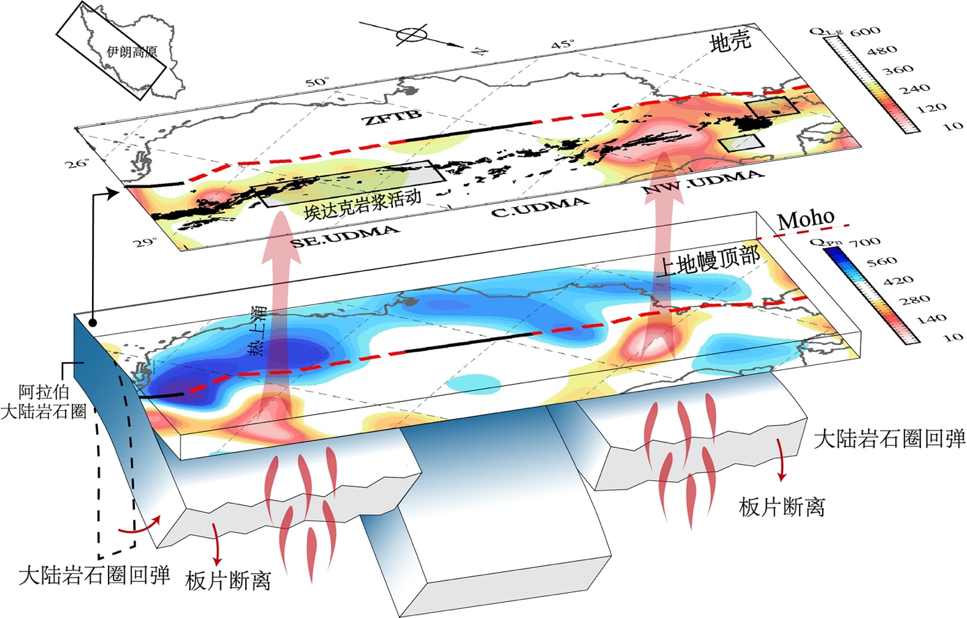 图4 UDMA下方板片断离和地幔上涌示意图。在地壳衰减图像中,UDMA中的新生代岩浆岩分布填充为黑色。在UDMA西北部和东南部观察到埃达克岩,标记为矩形阴影区域。扎格罗斯主逆冲断层(黑线和红色虚线)代表两个大陆板块的缝合线,其中红色虚线表示可能发生板块断离的区域(Agard et al., 2011)。红色箭头表示地幔热物质从板片断离的位置上涌,侵入地幔顶部和地壳,为地表年轻的火山活动提供热源