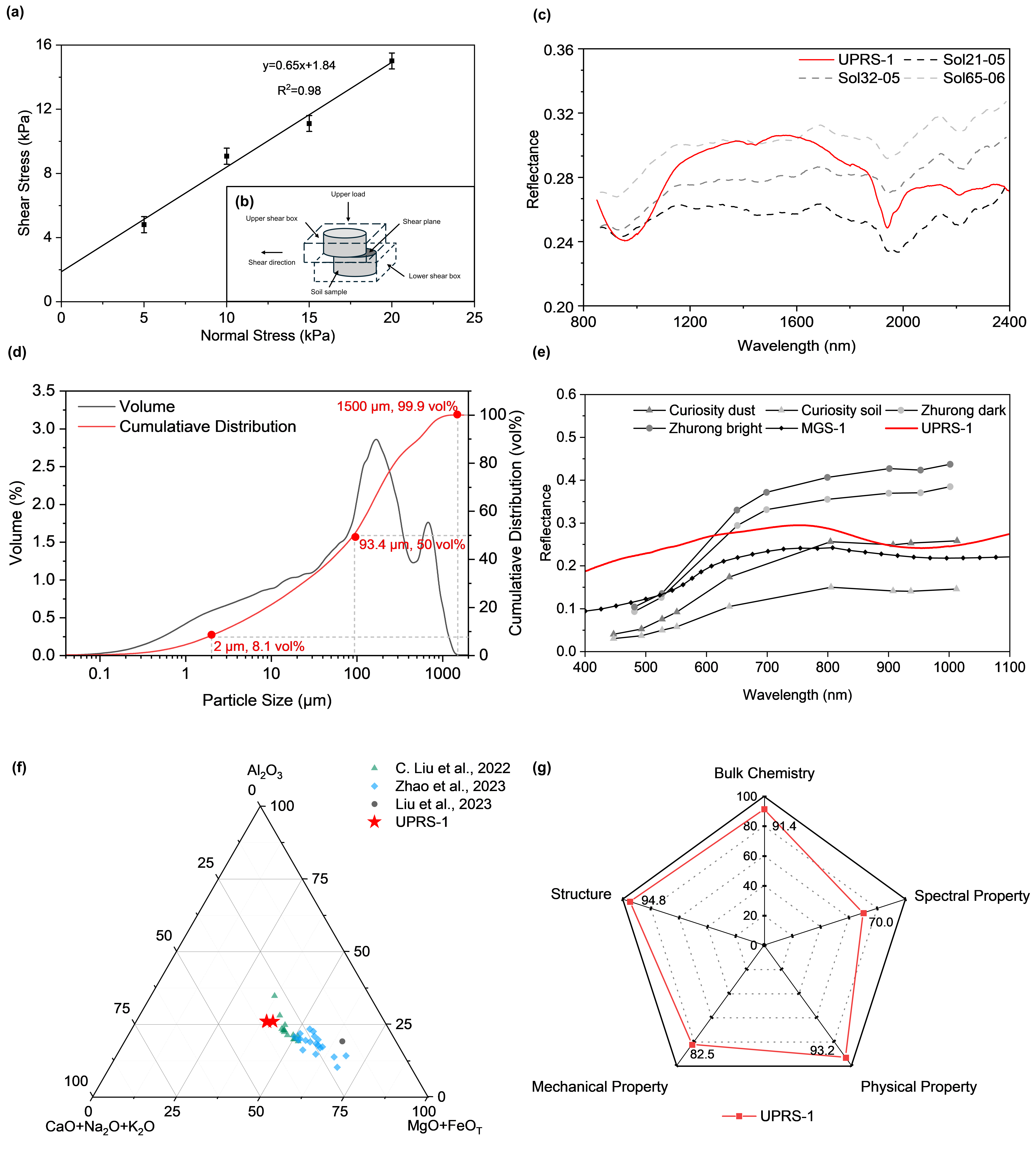 图2 UPRS-1模拟物各方面性质表征及相似度定量评价。(a-b) UPRS-1直剪试验结果(力学性质表征);(c) 祝融号SWIR在轨定标结果与UPRS-1近红外光谱结果对比(光谱性质表征);(d) UPRS-1粒径级配结果(物理性质表征);(e) 祝融号多光谱(MS Cam)结果和UPRS-1可见光近红外光谱结果对比(光谱性质表征);(f) 祝融号LIBS反演结果与UPRS-1主量化学元素对比(化学性质表征);(g) UPRS-1 在化学成分、物理性质、光谱特征、孔隙结构、力学参数等五方面性质的相似度定量化评估