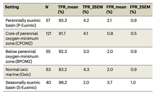 图1 页岩沉积环境示意图。图中灰色粗线代表细粒碎屑沉积物的大致位置。 基于现代海洋沉积环境(图 1)细粒碎屑沉积物的氧化还原敏感元素浓度特征及其已知的氧化还原状态,可创建能识别沉积环境的机器学习模型(分类器)。本项研究测试了6万多种元素组合和两种分类器(随机森林和K邻近算法),发现两种分类器均能利用Fe-U-V有效地区分5种主要的沉积环境(随机森林分类器的分类准确度见表1、图 2):长期缺氧带下方(本文用“缺氧带”代指“海洋最小氧带”)(Below Perennial Oxygen-Minimum Zone,下文称BPOMZ);长期缺氧带中心(Core of Perennial Oxygen-Minimum Zone,下文称CPOMZ);氧化环境(Normal Oxic Marine Settings,下文称Oxic);长期硫化盆地(Perennially Euxinic Basin,下文称P-Euxinic:); 间歇性硫化盆地(Seasonally Euxinic Basin,下文称 S-Euxinic)。将基于现代沉积环境的分类器运用到深时样品虽然会带来一定的不确定性,但总体是合理的(详细论证过程请参考文末的论文链接)。 表1 随机森林机器学习分类器区分现代沉积环境的准确度。N:现代细粒碎屑沉积物样品个数;TPR:真阳率;FPR:假阳率;mean:20次蒙特卡洛模拟结果平均值;SEM:20次蒙特卡洛模拟结果的标准误差(Standard Error of the Mean)。