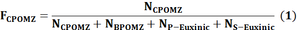 在利用细粒碎屑岩重建古海洋环境时,研究者通常把注意力集中在缺氧环境下形成的黑色页岩上,而对氧化条件下形成的细粒碎屑沉积岩的样品关注度不够。因此,为了避免这种现象对计算F值造成影响,公式(1)中分母没有使用NOxic。经测试,使用或不使用NOxic不影响重建的时间演化趋势。为了量化缺氧带的缺氧程度/持续性,以及硫化盆地的硫化强度/持续性,分别定义F'CPOMZ和F'P-Euxinic(注意:区分F与F'):