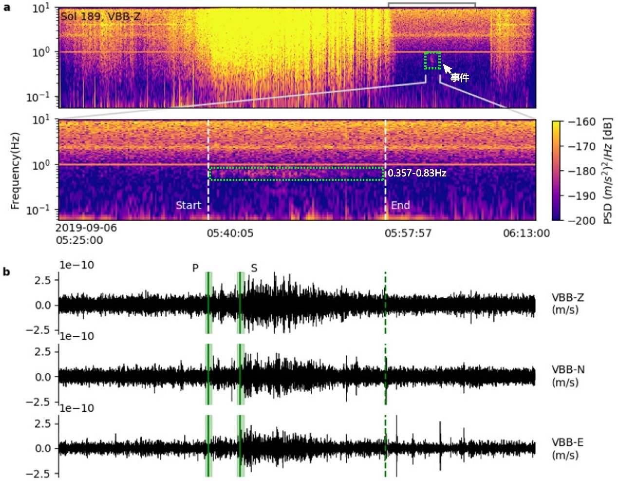 图1 检测到的火震事件,编号S0189。(a)火震事件的时频分析及其放大显示,图中绿色虚线框给出了事件检测的指示;(b)火震事件波形,滤波频段是图1a中绿色框线所示的0.357-0.83 Hz(修改自Giardini et al., 2020)