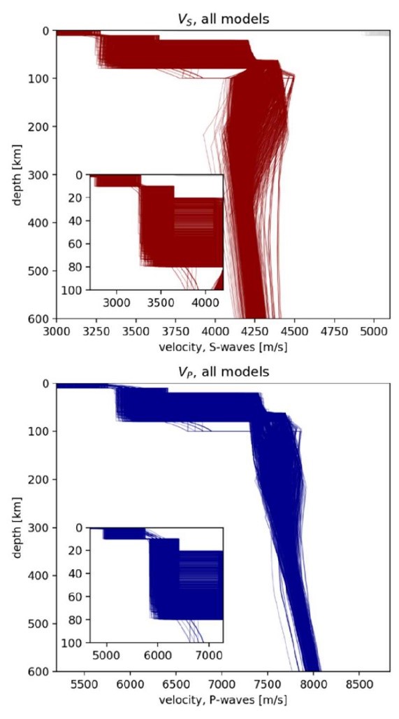 Giardini et al. (2020)共使用了2500个模型以保证最优模型空间的覆盖,这些模型是不同研究机构独立建立的,且满足质量、惯性矩(或转动惯量,moment of inertia)以及潮汐响应(tidal response)。特别地,这些模型也考虑了其它不同方法,如热演化模拟和反演,以及火星物质组成等。得益于两个高质量火震事件(图3绿色圆圈标注),即S0173a(S-P时差174±3s)和S0235b(S-P时差157±4s),可以观测到确定的P波和S波走时差,可以剔除60%的先验模型,最终使用2500个模型。