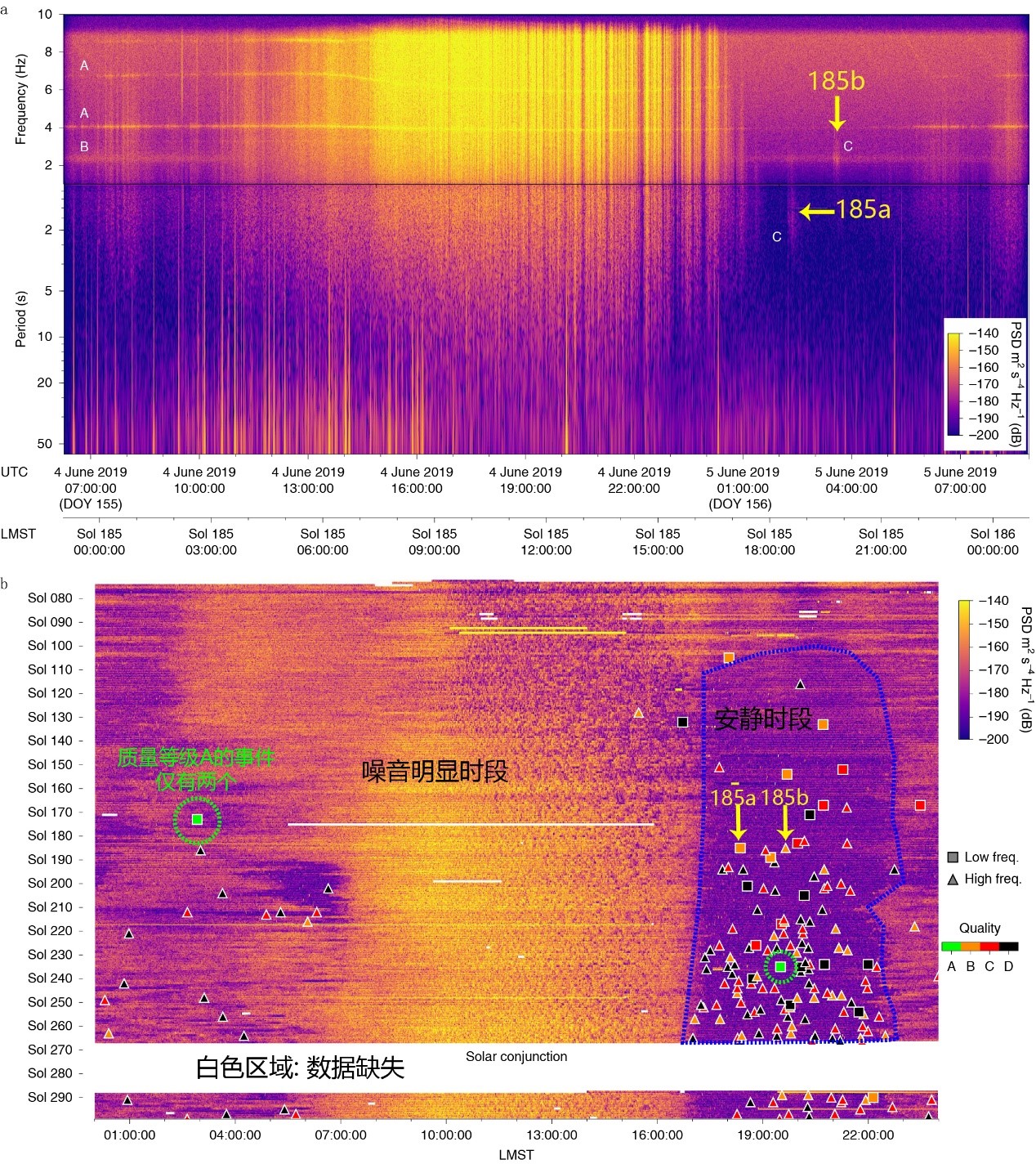 图3 (a)S0185a和S0185b事件检测;(b)174个火震事件的日期和时间分布。背景颜色代表噪声水平,事件三角形代表高频事件,震源位于地壳,方块代表低频事件,震源位于地幔。所有事件被划分为ABCD四个质量等级(修改自Giardini et al., 2020)