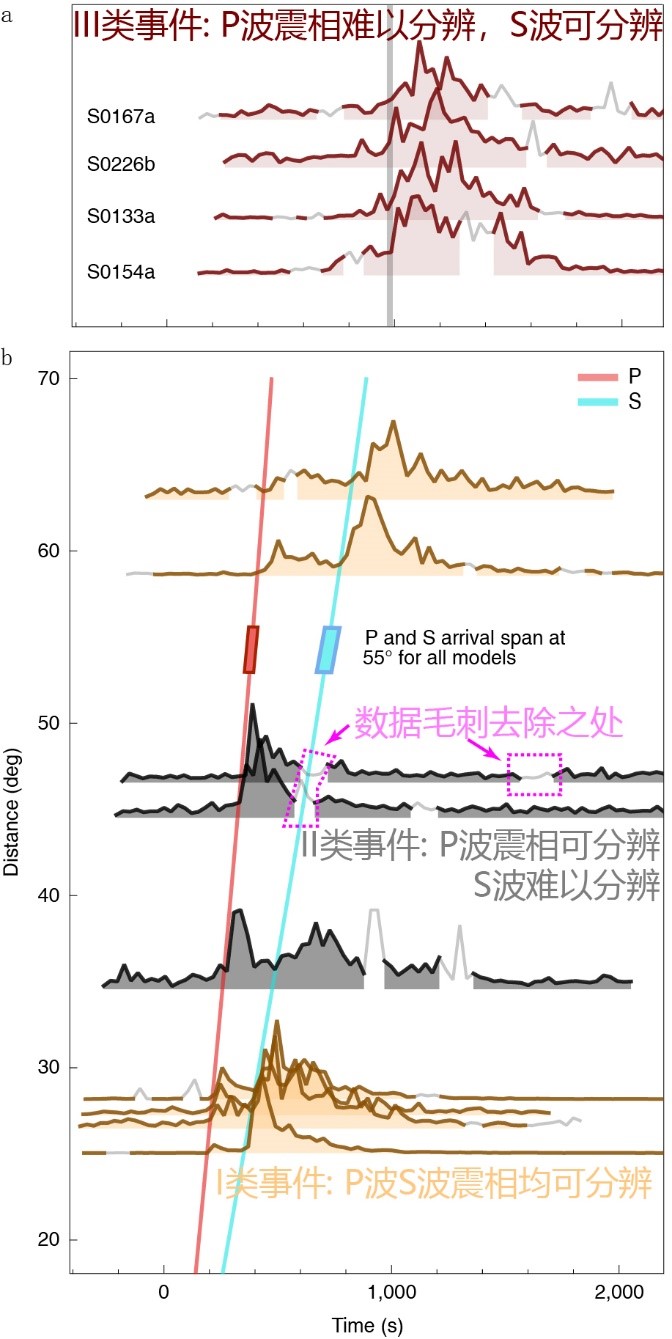 第II类事件,即S波震相振幅很小或不清楚。Giardini et al. (2020)基于震中距大于30°的S波振幅降低,推测上地幔深于300km存在明显低速体或强衰减区域。但原文作者在文中说明上地幔存在S波低速结构的推论与图4a中更远距离的III类事件呈现强S波振幅的观测不符。