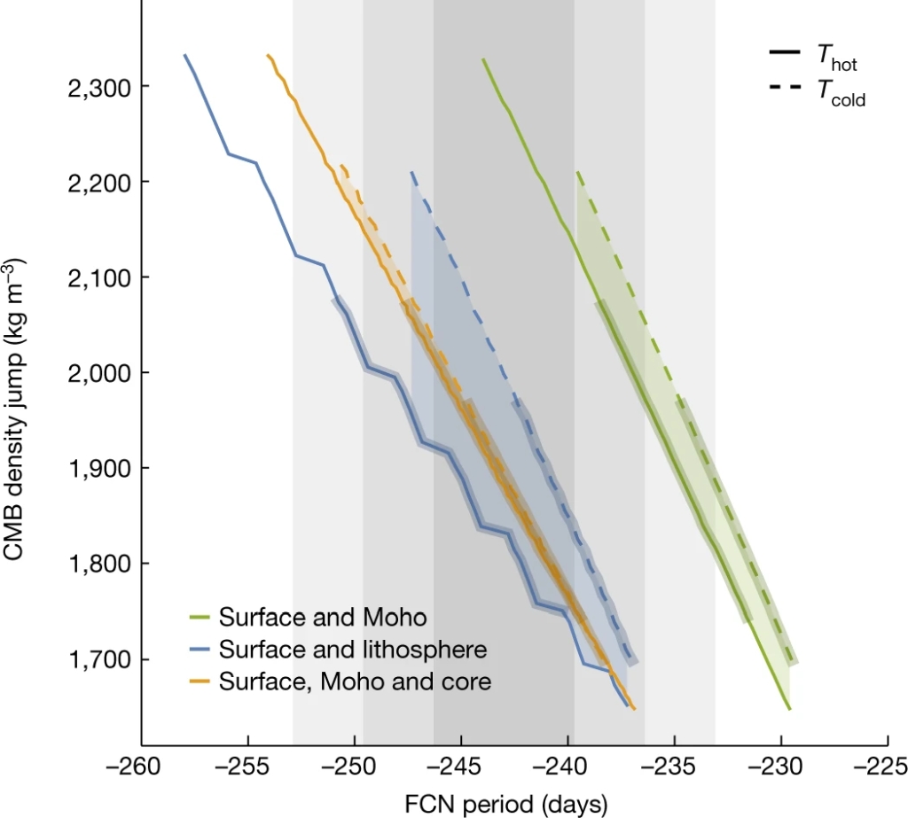 图4 火星核自由章动周期与核幔边界密度跳跃的关系(Le Maistre et al., 2023)