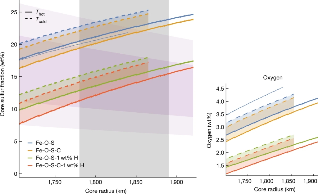 图5 火星核轻元素成分与半径之间的关系(Le Maistre et al., 2023)