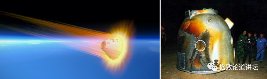 大家可以想象一下陨石降落,是不是和看到的这张图是一样的?其实,我们的神舟飞船返回地球的时候,和陨石降落是同一个现象。我们也可以看到宇宙飞船发光,在飞船上也会产生部分烧灼痕迹,这和陨石是非常相似的。