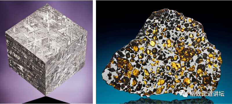 科学家经过很多年的研究,发现陨石其实也分很多类。通过陨石中金属铁镍的含量,可以将陨石分成石陨石、铁陨石,还有右图这样非常漂亮的橄榄陨铁,属于石铁陨石。铁陨石里90%以上都是铁镍金属,我们可以看到一些它自身具有的独特特征(左图)。这些陨石基本上都是来自位于火星和木星之间的小行星带,因为这些小行星的轨道很容易受到其他行星的轨道扰动,落到地球上就变成了陨石。