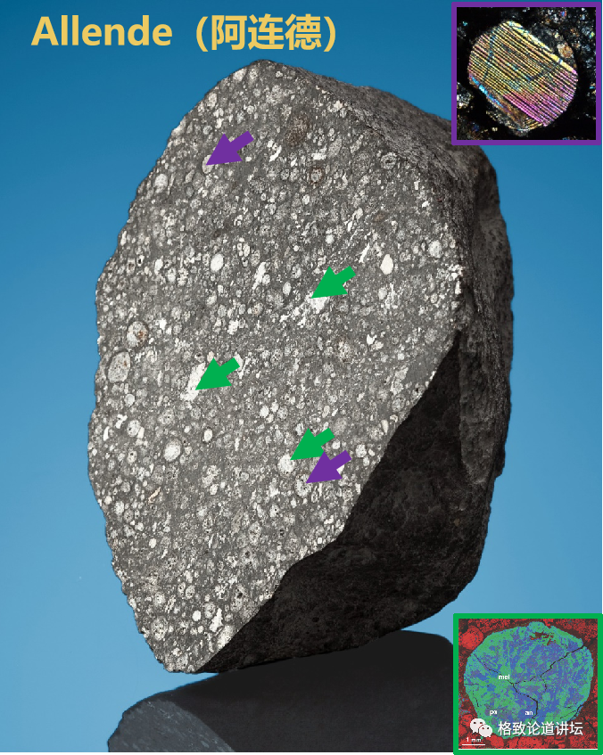 这是一块非常著名的陨石。1969年,它降落在墨西哥的阿连德镇,所以也叫阿连德陨石(Allende)。这块样品最独特的地方在于它保存了太阳系最早形成的固体,就是图片中绿色箭头所指的,放大到右下角的CAI,也叫富钙铝的包体。它帮助科学家精确划定了太阳系演化的起点,得出太阳系的年龄是45.67亿年。正是因为这块样品这么独特,科学家们才能根据这块样品去追溯、去发现我们太阳系在45.6亿年前发生了什么事情。它也帮助了好几百位博士通过研究它拿到了博士学位,所以这是一块非常重要的标本。