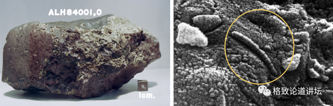 这是1984年美国南极考察队在南极的阿伦山脉回收的一块样品,叫做ALH84001。在1996年,一个震惊全球的结果诞生了:在这块火星陨石中找到了化石!就是右图中像虫子的这个部分。找到化石就说明了火星有生命。不过,后续研究发现,右图中这个疑似虫子的东西还真不是化石,而是一个定向排列的碳酸钙,和生命没有相关性。但是,这个工作直接促进了人类对火星的探测,包括后面的机遇号、勇气号、凤凰号、好奇号、毅力号,也包括我们现在的天问一号,都是为了去火星寻找与生命相关的一些痕迹。