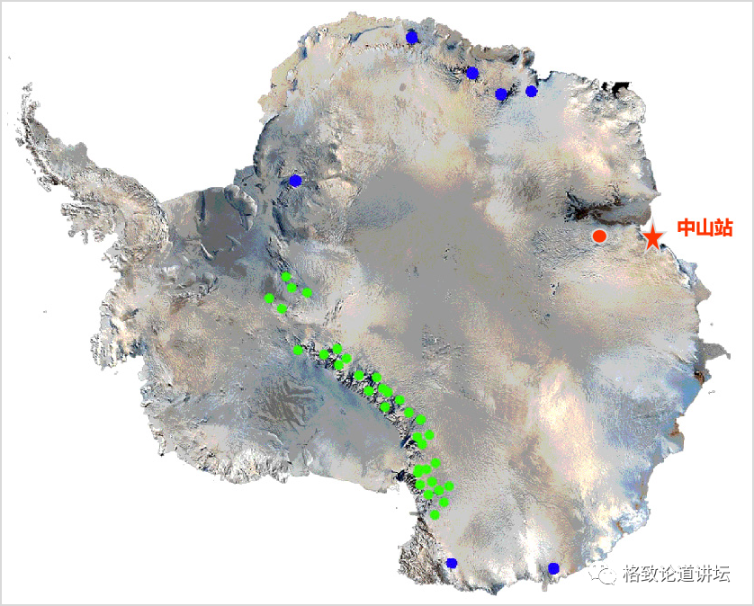 我们将已找到的陨石区域投到南极的地图上,绿色的是美国队找到的样品,蓝色的是日本队,红色的是中国。我们中国队虽然只去了一个点,但在这一个点就找到了1万多块样品,是目前为止南极最富集陨石的区域。
