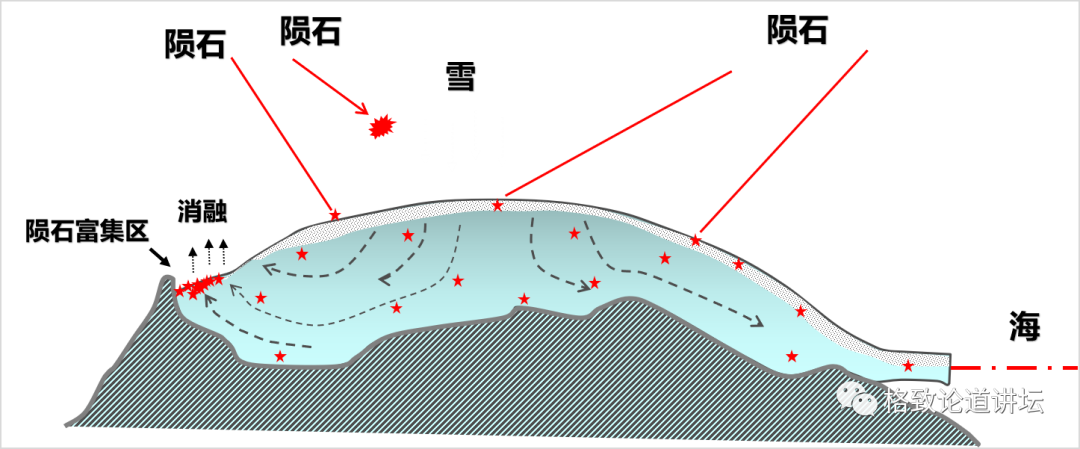 从地图上可以看出来,南极陨石的分布是有规律的,不是随机分布的。那么为什么有的地方没有陨石,有的地方有而且这么富集?这可以用上面这张图来去解释它。所有的陨石落在南极的时候会被保存在冰层或者雪里面,长时间来看,南极的冰雪会像水流一样流动。那么特别是遇到山的阻挡的时候,冰相对于石头来说,更容易蒸发掉,直接参与了大气的循环,但是石头就保存下来了。这就是南极为什么会有这么多陨石的原因。