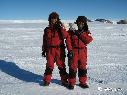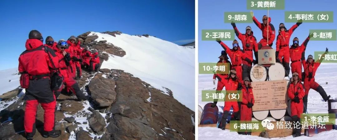 我们那次队里有10位队员,我排行老9。可能大家都看不清楚,都够黑的对吧。因为南极的那些自然条件,需要很多的防护装备。这一次组队也很有纪念意义,也是我们南极考察以来首次有女队员进入内陆考察。我们第一站设的目标就是南极格罗夫山的最高峰,叫做梅森峰。