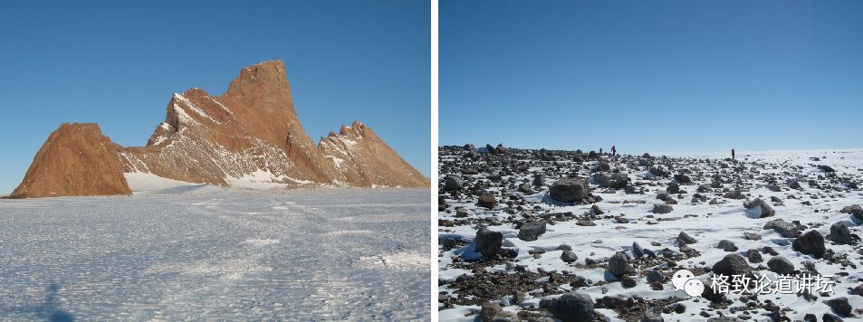 这是梅森峰的照片,大家可以看到它周围全是蓝冰。我们当时看到山脚下布满了石头,心里哇凉哇凉的,这怎么能找到陨石?全是石头,相当于要在石头里面挑石头,跟海底捞针是一个道理。但是,在里面仔细搜索几遍之后,我们就发现说这石头也不错。有直接从梅森峰掉下来的,也有从别的地方搬运过来的。能把别处的石头搬运到梅森峰的脚底下,那么也可以把别处的落下来的陨石搬运到这儿。