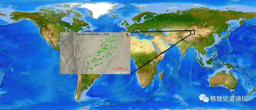 2010年,我国新疆的哈密地区发生了陨石雨降落事件。它就像是一场雨,图片中不同的绿色圆点代表了不同的石头的重量,是沿着线分布的,总共发现了大概四五百公斤的样品。为了确认这件事情,我们也组了个队去考察。