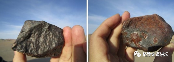 也正是因为这个过程,能让我们去区分什么是陨石,什么不是陨石。所有的陨石经过大气层的时候,它都会留下痕迹。烧蚀的痕迹会在陨石的表面上留下印记,形成一层黑黑的、薄薄的、1毫米左右厚的熔壳。