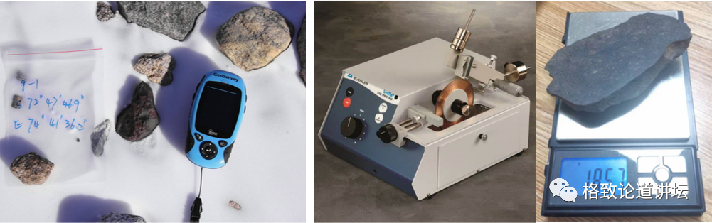 左:野外(拍照,经纬度) 右:实验室(称重,拍照,物性测量等,切割,加工)
