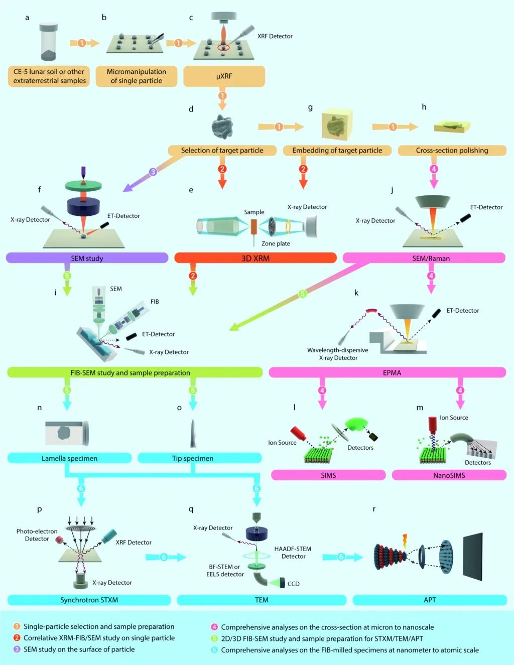 嫦娥五号月壤以及未来行星返回样品的单颗粒综合分析的“六步走”工作流程(简要版)。