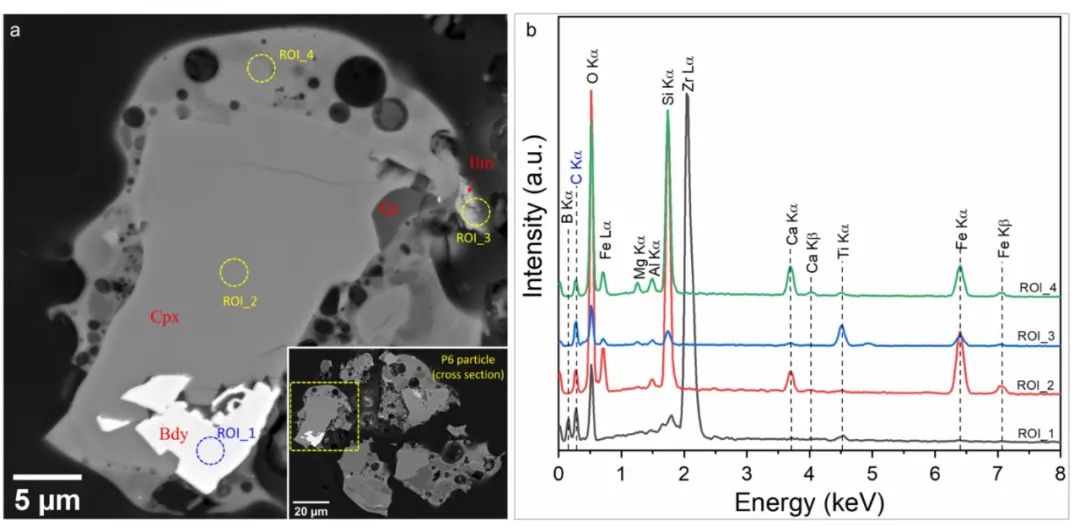步骤-4:目标颗粒截面样品的综合微区分析(如SEM、Raman、EPMA、SIMS和NanoSIMS),在微纳米尺度上获得样品截面的形貌、结构、矿物相、化学成分(包括主量、微量元素及其同位素)等信息。