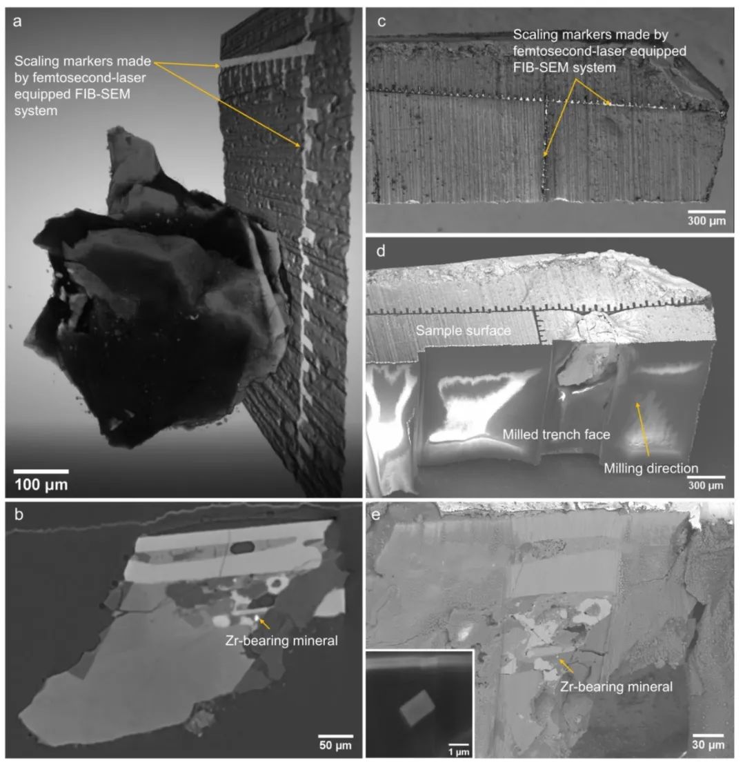 第一套方案虽行之有效,但机械抛光过程不能可视化,存在将目标矿物(如斜锆石等)提前磨掉或者损坏的风险。因此,在第二套方案中,研究人员将μXRF的化学元素成像与三维X-射线显微镜(3D-XRM)结构成像分析相结合,将富锆矿物从挑选出的富锆目标颗粒中精准定位(图4)。然后,利用虚拟数字化和3D-XRM与聚焦离子束-扫描电镜(FIB-SEM)三维切片技术,将富锆矿物中目标颗粒暴露到一个平整的截面上(图5),可用于后续的SIMS微区原位同位素分析。整个样品的FIB切割过程也可以通过SEM技术将其结构和化学成分分阶段地记录下来,从而部分地保留该样品的三维结构和成分信息。