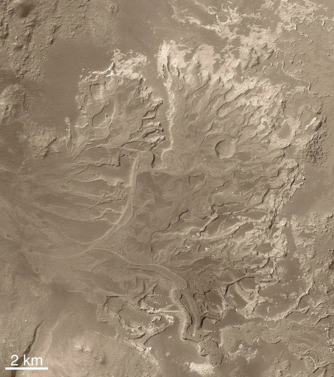 MGS(Mars Global Surveyor)探测器最重要的科学发现之一(也许没有之一),Eberswalde撞击坑附近形成的冲积三角洲。照片拍摄于2003年