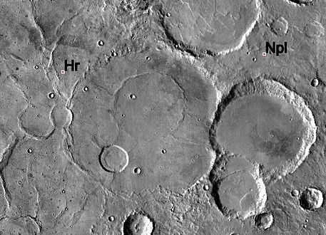 一张显示了西方纪地貌(左)和诺亚纪地貌(右)转换的图片。诺亚纪的撞击坑在西方纪继续遭到风化,并且显然西方纪的撞击坑小得多,也少得多