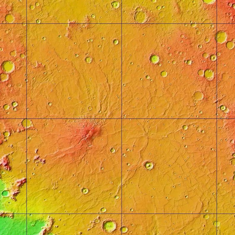 MGS探测器拍摄的赫斯珀利亚高原(画面中心)。显然,与周围的诺亚纪地貌比起来,赫斯珀利亚高原的陨石坑很小且很稀疏。