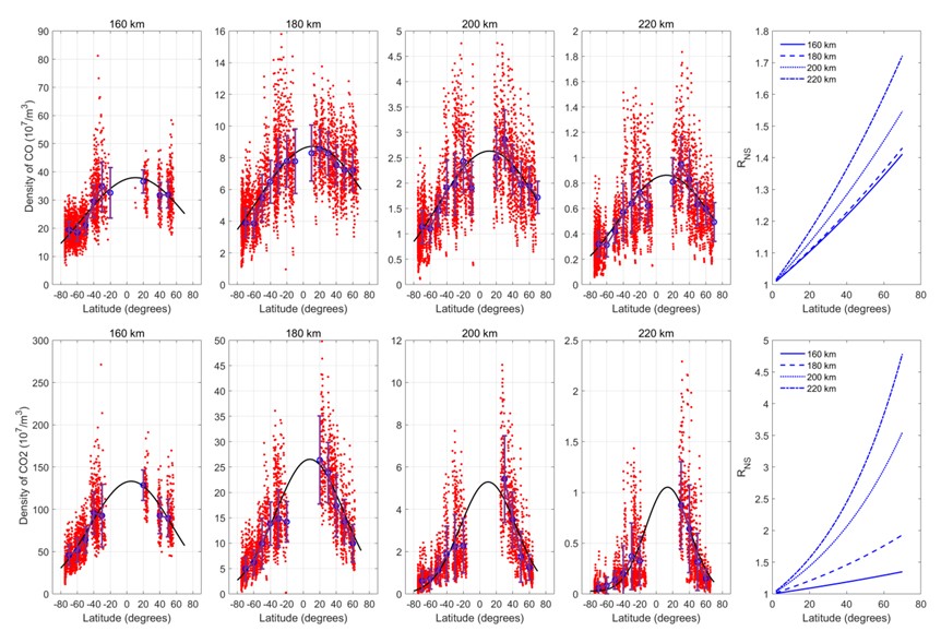 图2 热层CO与CO2密度在不同高度的纬度结构