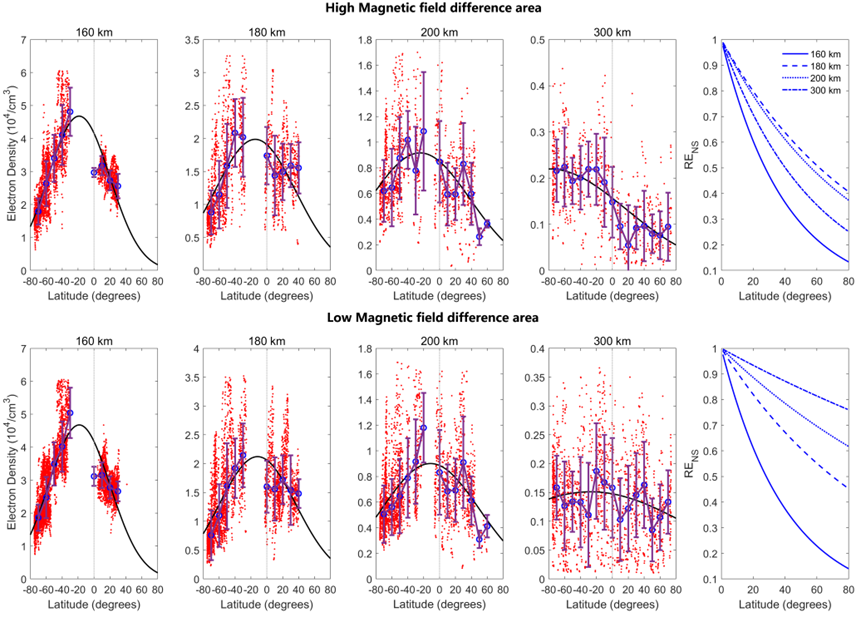 众所周知,火星的地形存在显著的南北半球不对称,火星的岩石剩余磁场也存在很强的半球差异。一方面,火星地形的巨大半球差异以及随之而来的沙尘暴可能会导致低层大气波动过程也存在半球差异。低层大气各种波动过程向上传播并进入高层大气影响其中的成分和密度。另一方面,火星磁场对高层大气带电粒子运动有直接的控制作用,从而可能影响高层大气电子密度及中性大气密度的分布。那么MAVEN数据显示的火星高层大气南北半球不对称性到底主要来自哪个方面?火星低层大气在气候学上如何影响高层大气,现有的观测数据不足,很难用这些数据研究低层大气与高层大气耦合过程中的半球差异。但是,行星磁场对高层大气的影响理解得更多,已经有一些研究探讨了火星磁场对火星电离层和热层的影响。此外,火星南北半球磁场的差异很大程度上取决于经度。在经度~120°与240°之间,南半球有很强的岩石剩余磁场,而北半球磁场较弱。在其他经度区域,南北半球之间的磁场差异较小。这为检验磁场差异的影响提供了天然的实验条件。因此,可以通过比较具有不同磁场差异的两个区域的结果来检验行星磁场差异与电离层热层南北不对称性之间的关系。