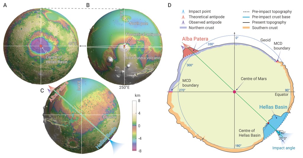 球面上位于球体直径两端的点互为“对跖点”,比如南极点为北极点的“对跖点”。由于行星尺度的“对跖点效应”,陨星撞击火星引发的地震波经过一段时间的传播后,将在撞击点的对跖点汇聚,可能导致地面隆升甚至火山喷发(图1)。火星Alba高原是Hellas撞击坑的“对跖点”,然而,它在纬度上相对于理想对跖点向南偏离约2°(约119 km)(图2),但导致该偏差的原因尚无定论。通过研究该偏差的成因有望为研究火星早期演化过程提供新的约束。