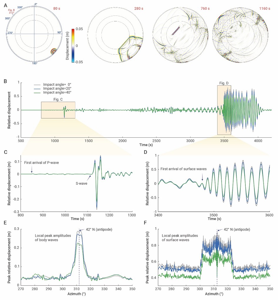 图3 陨星撞击波场在对跖点附近的汇聚过程。(A) 径向位移的波场快照;(B–F)显示了不同撞击角度下理论对跖点(方位角312°)处的径向位移及峰值分布;(B)波形比较;(C)体波的局部放大;(D)面波的局部放大;(E)体波窗口内理论对跖点附近的局部峰值径向位移分布;(F)面波窗口内理论对跖点附近的局部峰值径向位移分布