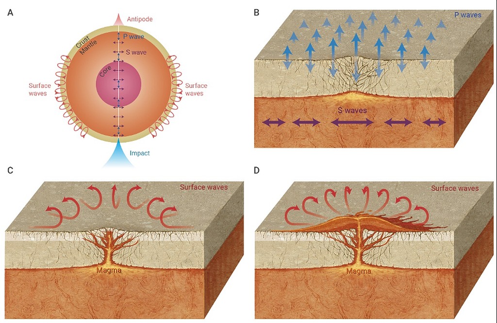 图1 陨星撞击火星引起的地震波在对跖点汇聚触发火山喷发。(A)体波穿过壳幔核,面波绕火星表面在对跖点汇集;(B)体波引起对跖点附近局部隆起和轻微的开裂;(C)面波引起地面形成更大的裂缝;(D)对跖点附近的地下岩浆沿着裂缝喷发形成火山