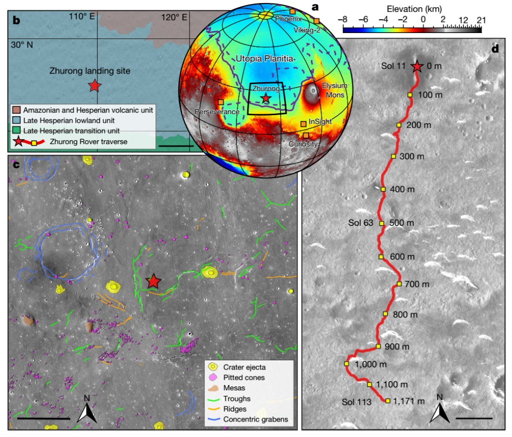 图1 祝融着陆区地质地貌图。(a)祝融号、凤凰号、洞察号、好奇号、毅力号和海盗号着陆点位置及古海岸线位置;(b)祝融号着陆点附近的简化地质图,比例尺为200千米;(c)祝融号着陆点附近的地形地貌图,比例尺为15千米;(d)祝融号行驶路径图,比例尺为100米