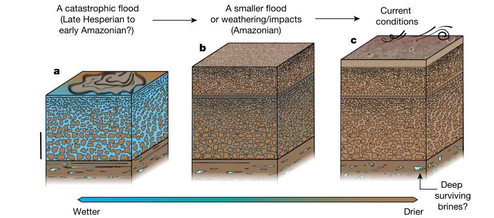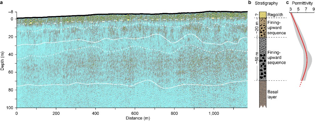 (2)深度在10-30米的第二层沉积序列,可能是着陆区中晚亚马逊纪火表改造事件的结果。短时洪水、长期风化或重复陨石撞击作用可能形成了这一层中向上变细的沉积层序(图3b)。