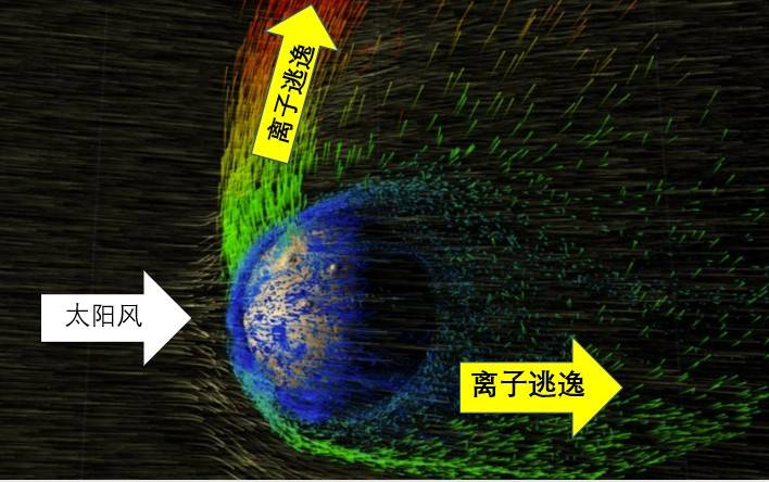 火星大气离子会在太阳风施加的电磁作用力下向外运动,远离火星,并最终逃逸到星际空间中(图2)。类似于火星,金星由于也没有全球性偶极磁场,部分金星大气也是通过离子逃逸的方式被太阳风剥蚀而损失掉。