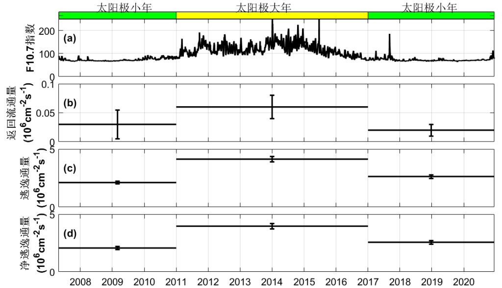 (2)发现在极大年期间,返回流通量更强,但是尾向逃逸通量也是增加,并且其量级更大,导致在极大年期间,逃逸的离子数目更多。这也说明无论太阳活动水平如何,相比于逃逸离子流,返回流并不显著,因此返回流是不能有效减少逃逸量,从而不能有效影响火星大气演化过程(图4)。