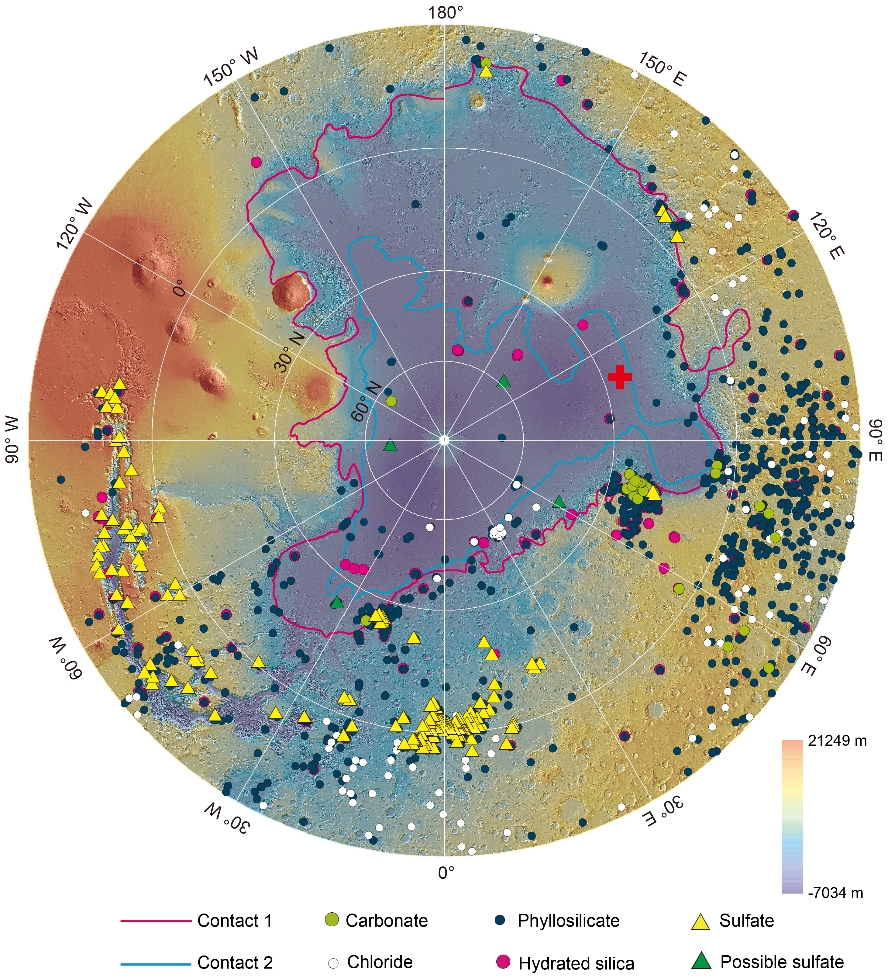 图1 已发现的火星含水矿物主要分布在南部高地,而北部低地平原极少。海陆界面1(Contact 1)和海陆界面2(Contact 2)为推测的古海岸线;“祝融号”火星车着陆点用红色十字标示